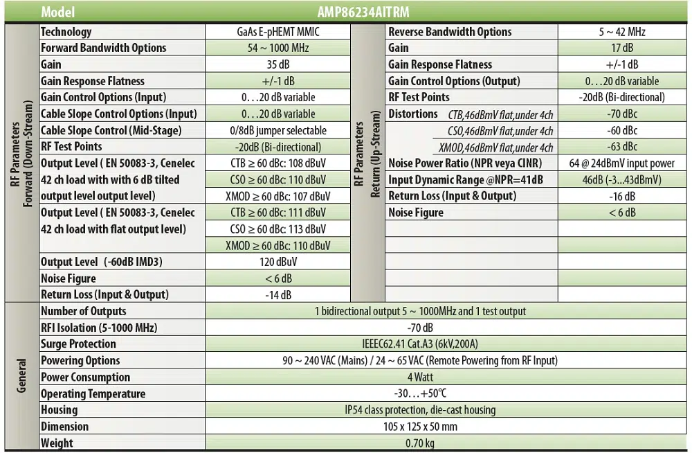 Eight AMP 86234 AITRM là bộ khuếch đại chuyên dụng dùng khuếch đại tín hiệu cho hệ thống truyền hình cáp.
